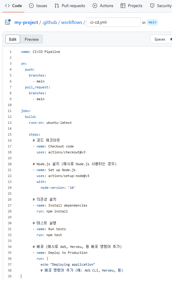 위 예시는 Node.js 애플리케이션을 대상으로 작성된 CI/CD 파이프라인의 예입니다. 실제 프로젝트에 맞게 의존성 설치, 테스트 실행, 배포 과정은 달라질 수 있습니다.